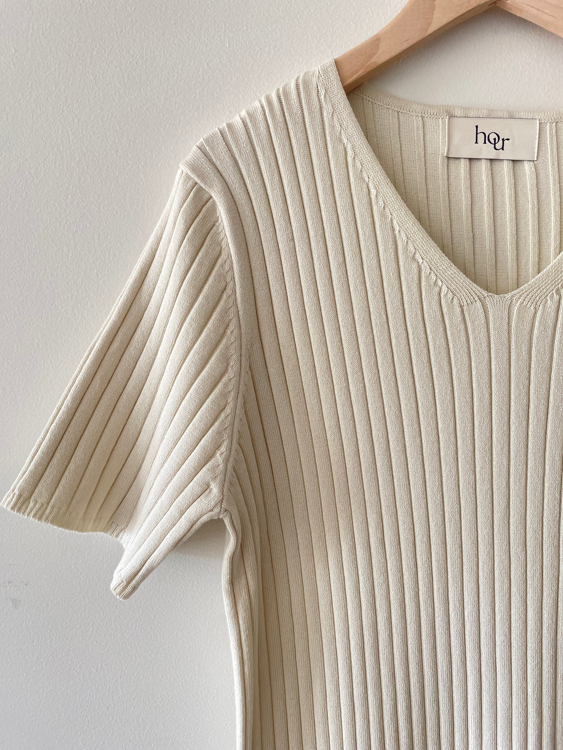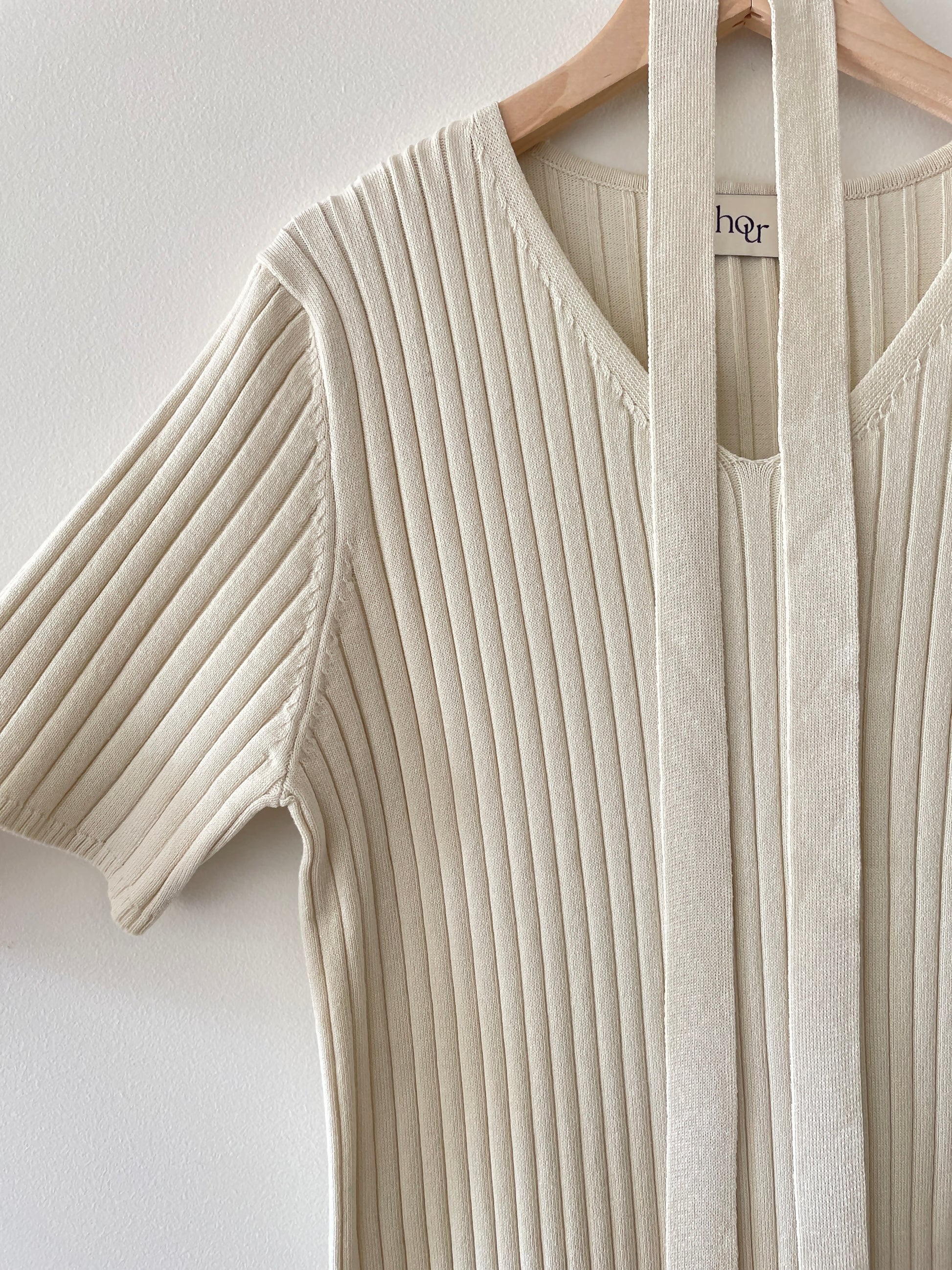 This elegant V-neckline long dress is made from a ribbed fabric, providing a sophisticated touch to your wardrobe. The high-quality material offers both comfort and style, making it a perfect choice for any occasion. Elevate your look with this premium dress.
